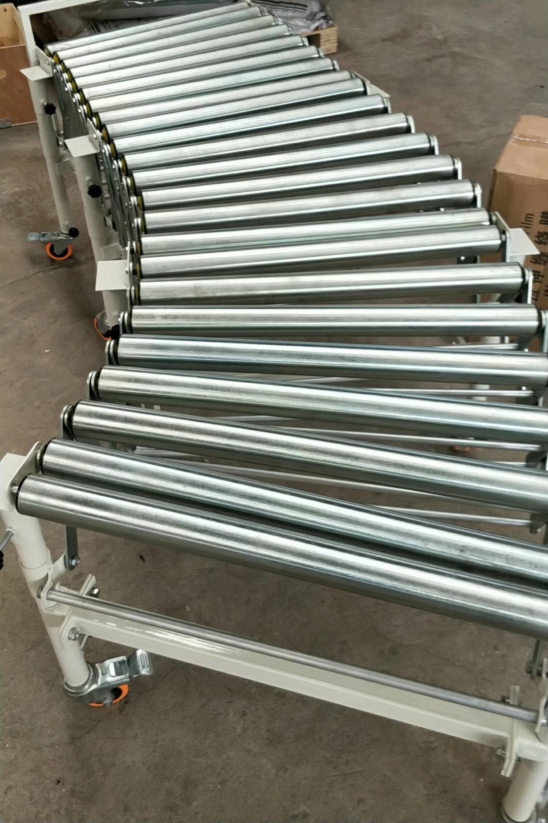 可移動伸縮滾輪輸送線指的是利用福來論或者其他滾輪自滑動的原理把貨物從高段到低段滑動輸送,隨著物流行業的快速發展,傳統的人工搬運方式已無法滿足現代高效、快速的物流需求。所以可移動伸縮滾輪輸送線快速的普及,